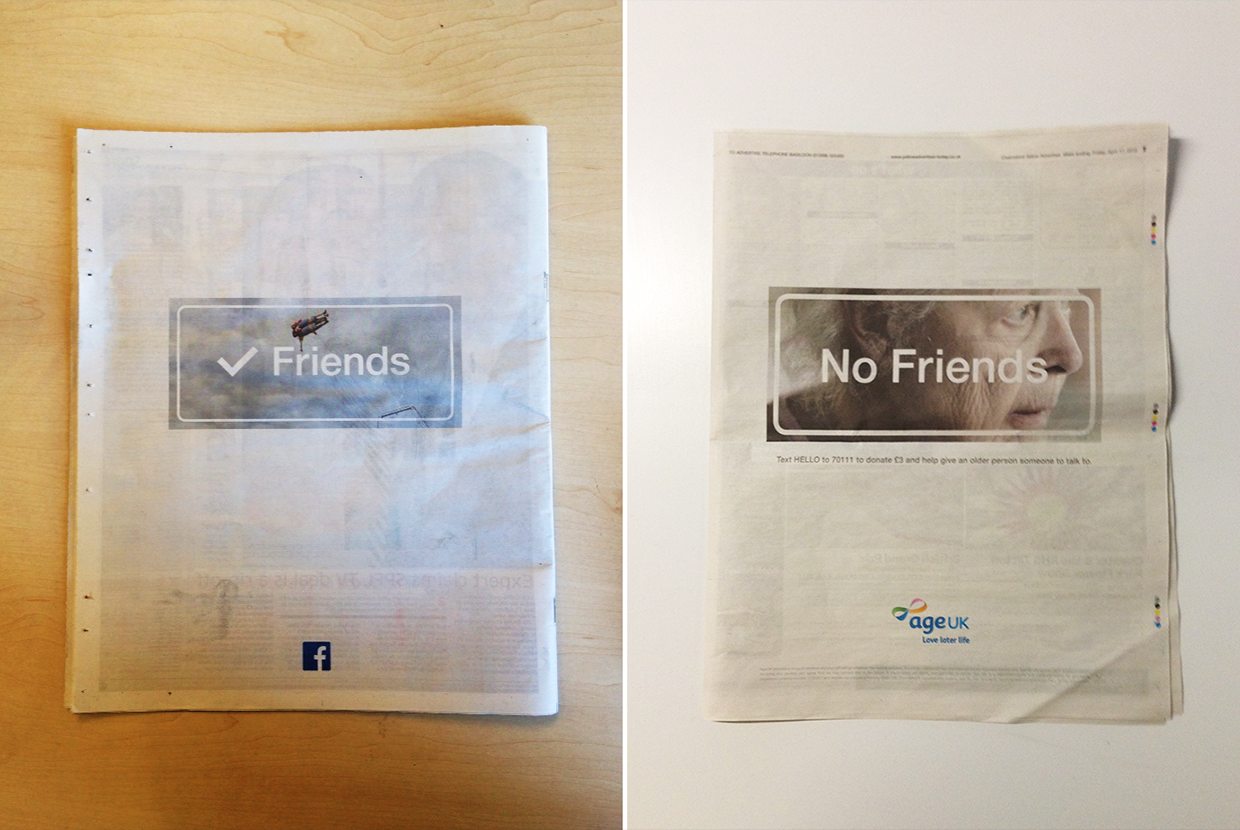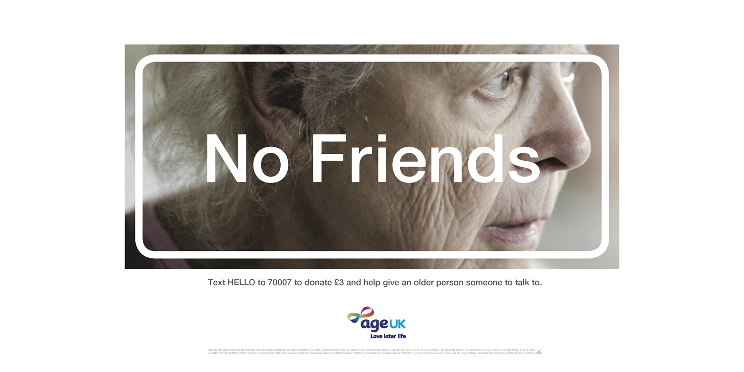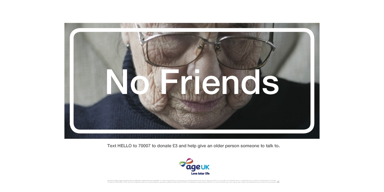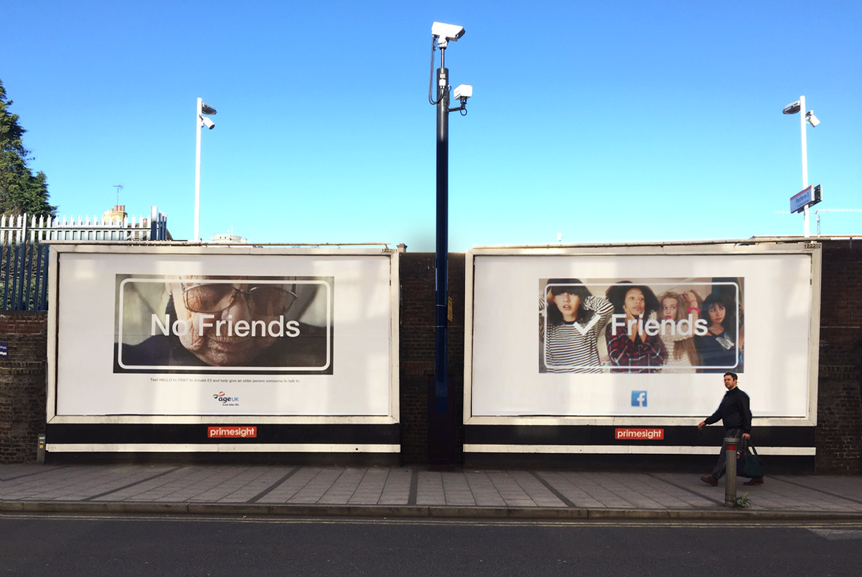 Age UK ‘No Friends’ - Hijacking a multimillion pound Facebook campaign to combat the problem of loneliness in older people after learning that over 1 million older people in the UK go more than a month at a time without seeing or speaking to anyone.